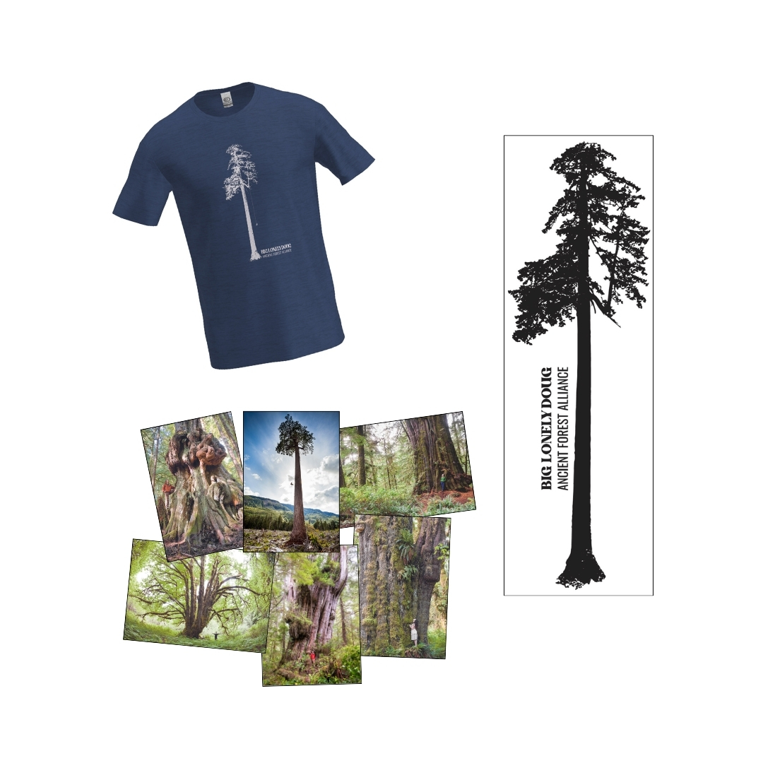 Celebrate Big Lonely Doug and save over $15 with a BLD unisex shirt, a sticker, and Big Tree bundle of 6 greeting cards.
